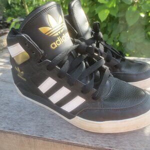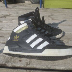 Adidas Black Gold and White Hard Court High J Leather Hi-Tops Athletic Sneakers - Size 9 Men's. In excellent to near brand new condition. The white rubber foxing and bumper does show very light dirt wear. The rest of the sneakers including the bottom sole looks like near new. Cleaned, stain and odor free. Brand new Cougar comfort foam black insoles. It fits true to size.