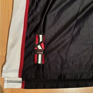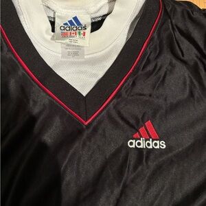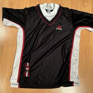 Adidas sports jersey in black and white with red accents. Features a v-neck design and short sleeves. The size is small but it is an oversized small! Good condition. Very nice piece!