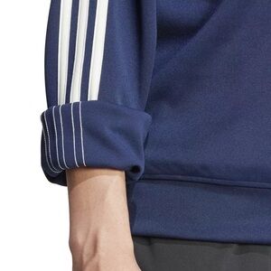 Classic Adidas jacket in blue. Features white stripes and quarter-zip design. Iconic logo on chest.