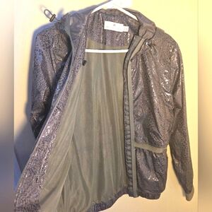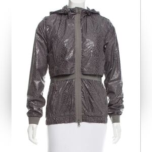 Stylish gray windbreaker jacket with animal print design. Features a hood and zip closure.