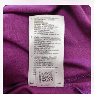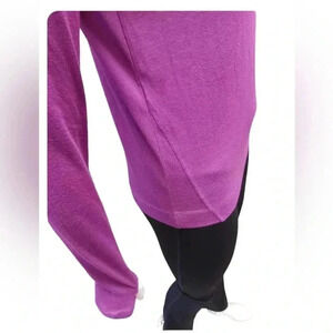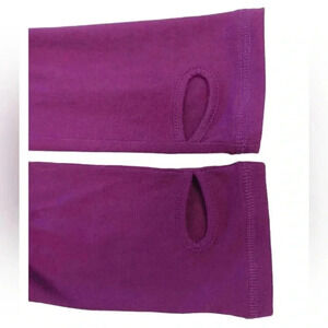 Fuchsia in color, this long sleeve shirt has a scoop neck and thumb holes. Brand call out on back of top in rhinestones and embellishments. Some Ruching around the shoulders elevates this top.