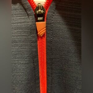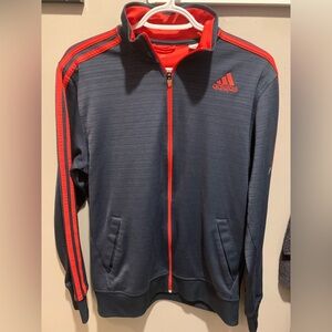 Adidas jacket in dark blue with vibrant red stripes. Full zip closure and convenient side pockets. Slight wear on the zipper and tag.