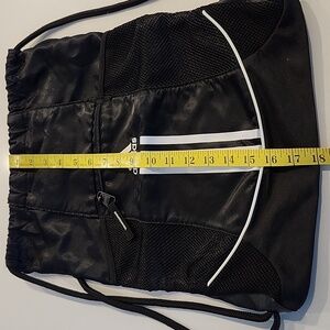 Drawstring is perfect for shoulder or as a backpack and is completely intact without fray. Super clean and ready for the gym or shoes.
