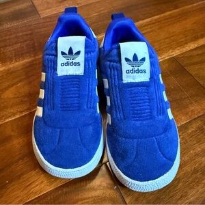 These Adidas sneakers showcase a vibrant blue upper with signature white stripes, crafted from a mix of suede-like and knit materials for a stylish look. The slip-on design ensures easy wear, while the flat white sole offers a casual, comfortable fit perfect for everyday activities.