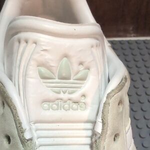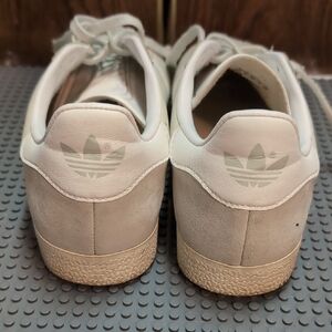 Classic Adidas sneakers in light tan. Features lace-up design and iconic stripes.