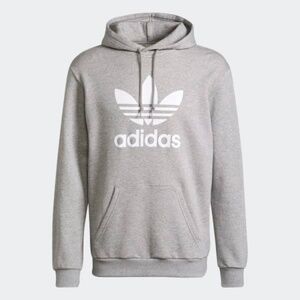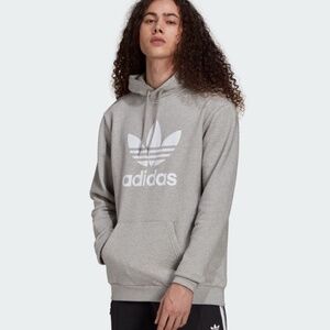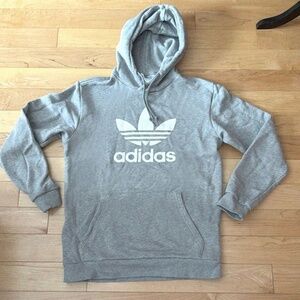 Comfortable gray hoodie. Features iconic white Adidas logo. Perfect for casual wear.