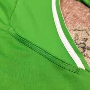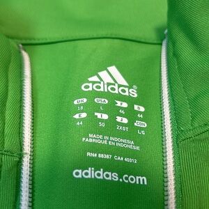 Super cute zip up by Adidas. Green and white. Signature stripes along each side of waist. White Adidas logo on left breast. Size large. Excellent condition.