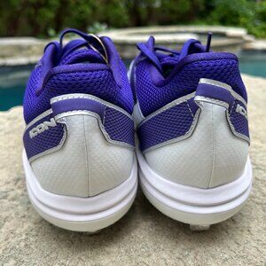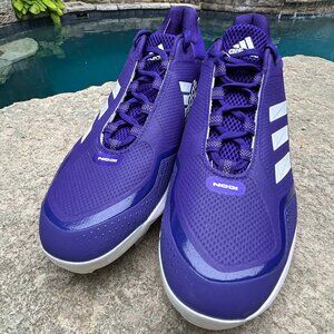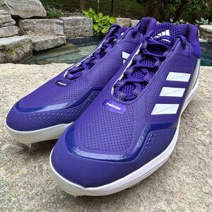 A new pair of size 13.5 Adidas Icon 7 Baseball Cleats including all tags but without a box. The color pattern is Purple/White. Model S23854. Tag is distressed.