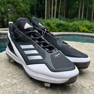 New pairs of Adidas Icon 7 Boost Baseball Cleats including all tags but without boxes in sizes 13, 13.5 and 15. The color pattern is Black and White. Model FY4178. Tag on the size 13 pair is distressed.