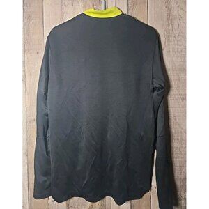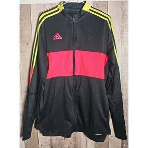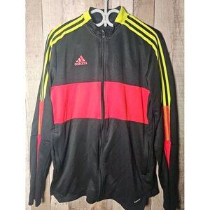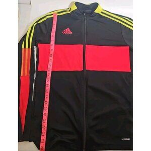 Stay on top of your game with this Adidas Men's Track Jacket in size Large. Featuring a sleek black design with red and accents, and the iconic three stripes in yellow. This jacket has a full zip closure, and is perfect for your active lifestyle. Made with a polyester blend outer shell, it offers both comfort and durability. With long sleeves and convenient pockets, this jacket is ideal for any casual or workout occasion. Complete your activewear collection with this stylish and functional Adidas Track Top.