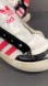 These Adidas sneakers feature a stylish combination of white and pink, with the iconic three stripes in pink on the side. The shoes offer a classic retro design with a padded ankle collar for added comfort and support. Perfect for everyday wear, these sneakers blend style and functionality seamlessly.