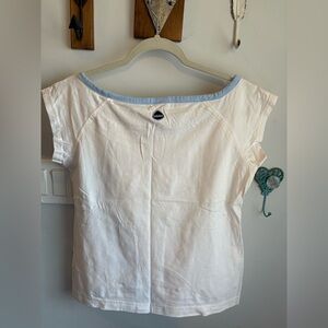 Comfortable white tee with light blue neckline. Features classic Adidas logo. Ideal for everyday wear.