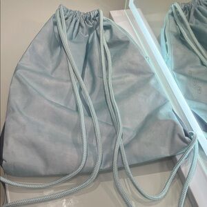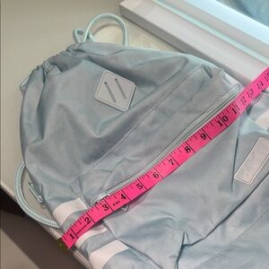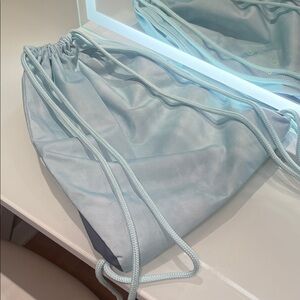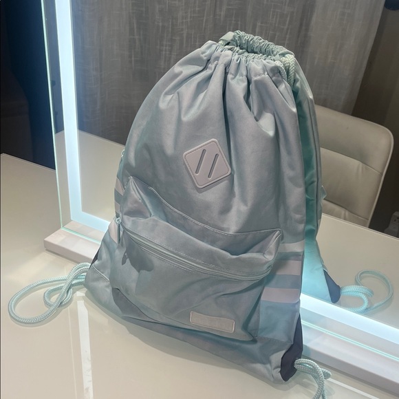Stylish light blue drawstring backpack with front pocket. Perfect for daily use.