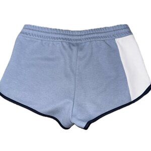 Barely worn Adidas Originals lounge shorts in a soft light-blue color with a sleek white side panel and navy trim. Features the classic Trefoil logo on the front for that timeless sporty look.