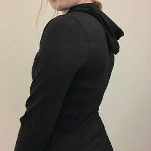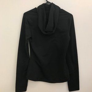 Hooded long sleeve shirt with sweat-wicking fabric.