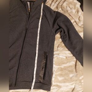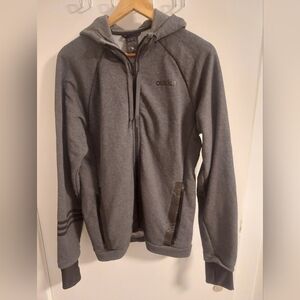 Sleek dark gray jacket with hood. Ideal for active wear. Features subtle branding and zip closure.