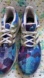 a pair of Adidas Energy Boost ESM running shoes, featuring a distinctive geometric print on the upper. These sneakers are designed with a Boost midsole for cushioning and energy return, making them suitable for activities such as running or standing for extended periods. The geometric pattern on the upper is a mix of blue, purple, and pink triangles, giving the shoes a vibrant and eye-catching appearance. The three stripes on the sides are a classic Adidas design element. The shoes also have a "techfit" label near the toe area.