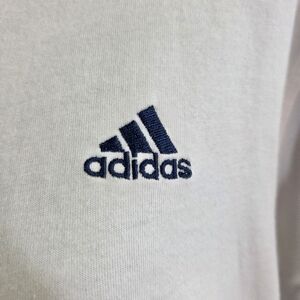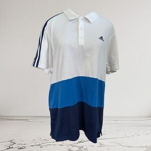 Stylish Adidas polo with a white base and bold blue stripes. Comfortable and versatile for any setting. Length 27" Bust 42" Sleeves 9"