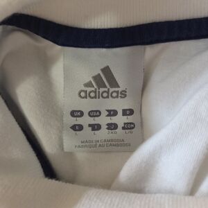 Stylish Adidas polo with a white base and bold blue stripes. Comfortable and versatile for any setting. Length 27" Bust 42" Sleeves 9"