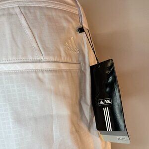 Adidas Men's White Check Long Climalite Golf Shorts - Size 33 - NWT. New with tags, but there is a small 1mm mark on back of one leg as seen in 4th photo. Style W67367. Two front pockets, two back pockets. Zip fly. 100% polyester.