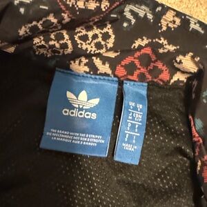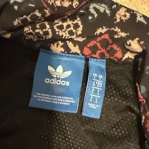 Adidas jacket with intricate multicolor design. Features a blend of red, blue, and black patterns.