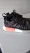 Adidas NMD R1 sneakers with a black and white Primeknit design. Features pink accents and a comfortable sole.