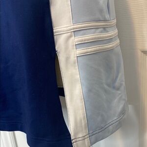 Chic Adidas athletic dress in blue and white with front logo and criss crossed straps on back and built in shelf bra.