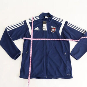 The full zip-up design offers versatile styling while the signature Adidas logo emphasizes your fierce team pride.