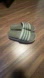 Comfortable Adidas slides with olive and gray stripes. Perfect for casual wear.