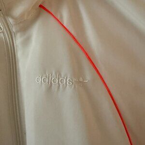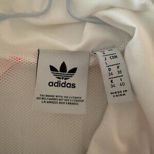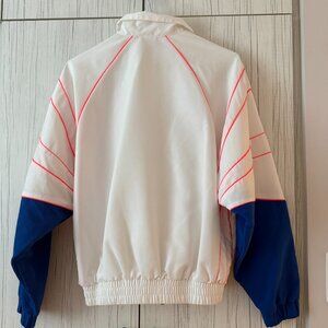 Retro-inspired adidas Originals Equipment ADV/91-18 track jacket featuring a crisp white base with neon pink piping and contrasting royal blue sleeves. Made with lightweight fabric and a mesh inner lining for breathability. Elastic cuffs and hem ensure a secure, comfortable fit. Perfect for sporty streetwear looks or casual layering that blends classic 90s style with modern flair.
