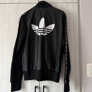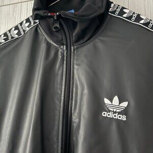 A sleek and sporty Adidas Originals track jacket featuring a matte faux-leather front panel, ribbed cuffs and hem, and signature Trefoil logo taping along the shoulders. The full-zip closure and soft inner lining make it perfect for layering or as a statement outerwear piece. Ideal for casual streetwear or athleisure looks.