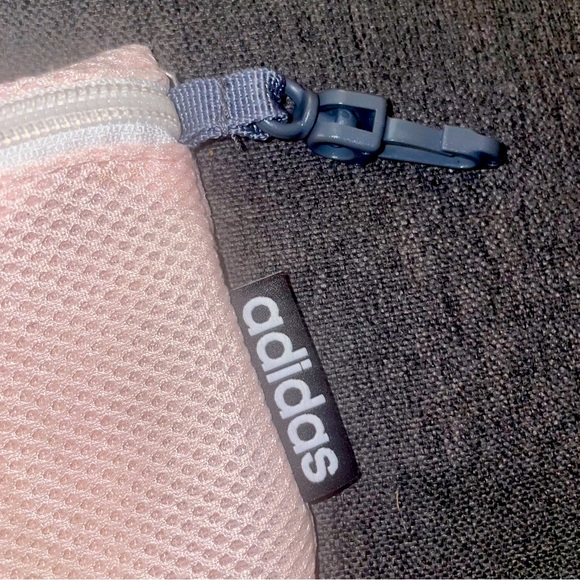 Adidas pink mesh pouch with zipper closure. Stylish and functional.
