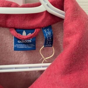 Stylish red Adidas track jacket with white stripes. Features a zip-up front and side pockets.