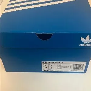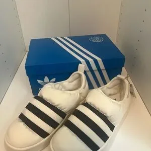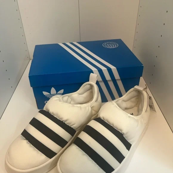 Comfortable Adidas slip-ons featuring bold black stripes on a white base. Keep your feet warm and stylish! Brand new with box