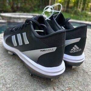 A new pair of Adidas PureHustle 2 Softball Cleats with all tags attached but no box. Cleats are metal. The color is Core Black/Silver Metallic/Silver Metallic. Model H00984. Size is Women’s 8