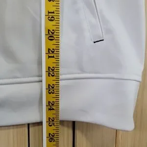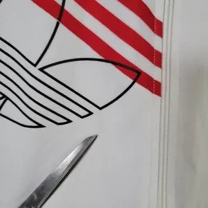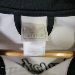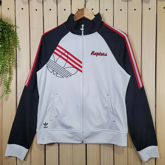 Stylish Adidas track jacket with Raptors logo. Features red stripes and a sleek design.