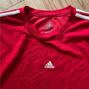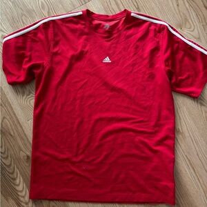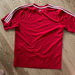 Bold red tee with signature white stripes. Comfortable and stylish for any occasion. Size medium, in overall very good condition (small stain as seen in last picture)