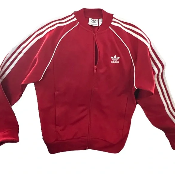 Stylish Adidas track jacket in vibrant red with white stripes. Perfect for casual wear.