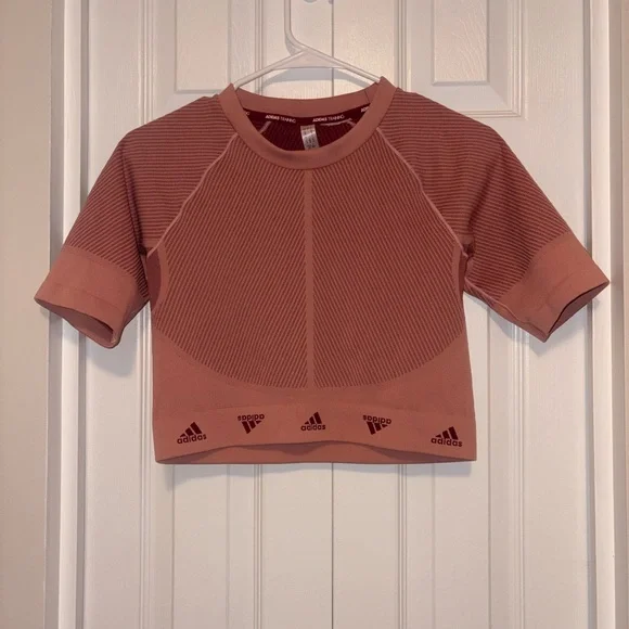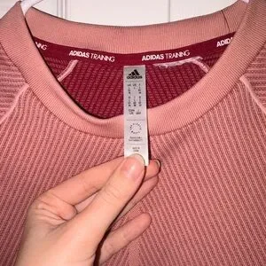 Stylish Adidas training top in rose. Features ribbed texture and logo accents. It’s a size L, but it’s a tight material and could accommodate any sizes from S to L. The care instructions tag is missing, but it has washed well (no signs of wear or change in size) in our regular cycles of cool wash and delicate dry cycle.