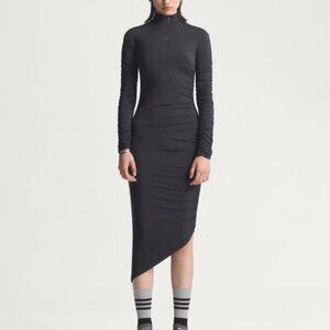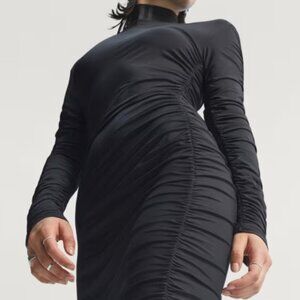 100% Stretch Polyester. Ruffled full side hem. Ruffle long sleeves.