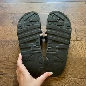 - Black and white slide sandals