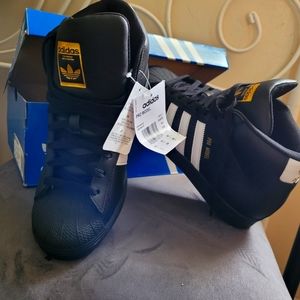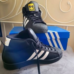 Brand new addias black and white with gold writing high top shells . Classic shoe brand new with tags.