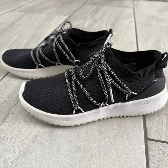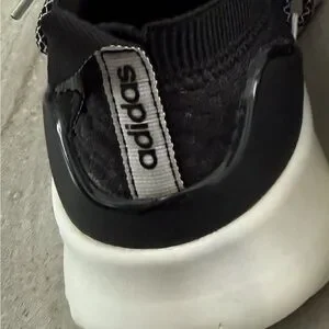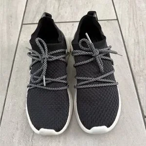 Stylish black and white athletic sneakers with a modern design. Features a comfortable knit upper and contrasting laces. Excellent condition