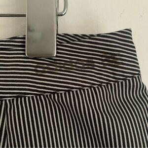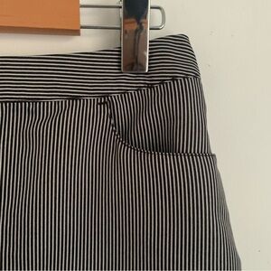 Performance-ready and stylish athletic mini skirt by Adidas in a classic black and white pinstripe. Features front pockets and a pleated lower panel for ease of movement. Breathable fabric makes it perfect for golf, tennis, or casual activewear.