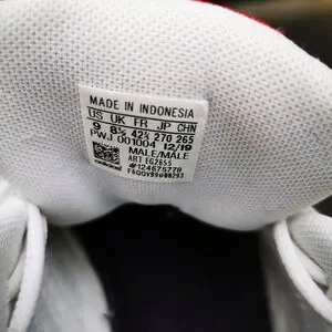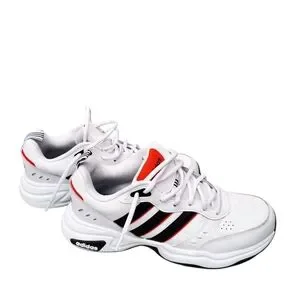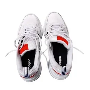 Stylish Adidas strutter wide in white with black accents. Features a bold red logo.