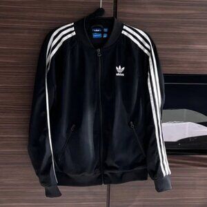 Classic 3 stripe on sleeves and small Adidas logo embroidered on the chest.