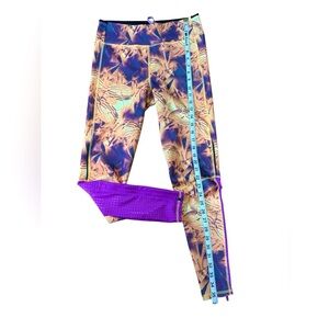 Their 7/8 (cropped) design offers optimal freedom of movement, and the purple perforated inserts add a touch of style and breathability. They also come with a discreet small back pocket for your keys or small essentials. The vibrant geometric print makes them unique.