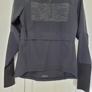 This running jacket has refective on both front and back for easy visibility. there are thumb holes and zipper pockets.