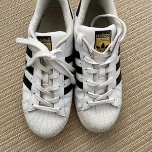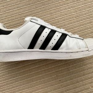 8/10 condition. Rarely worn adidas superstars with shell toe. White with black stripes. Adidas size 6.5. Euro size 38. Fits a women’s 7.5/8. Great condition.