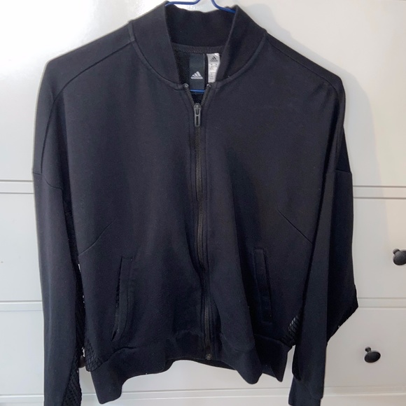 women black Adidas zip up sweater with grey stripes and a net back & arms